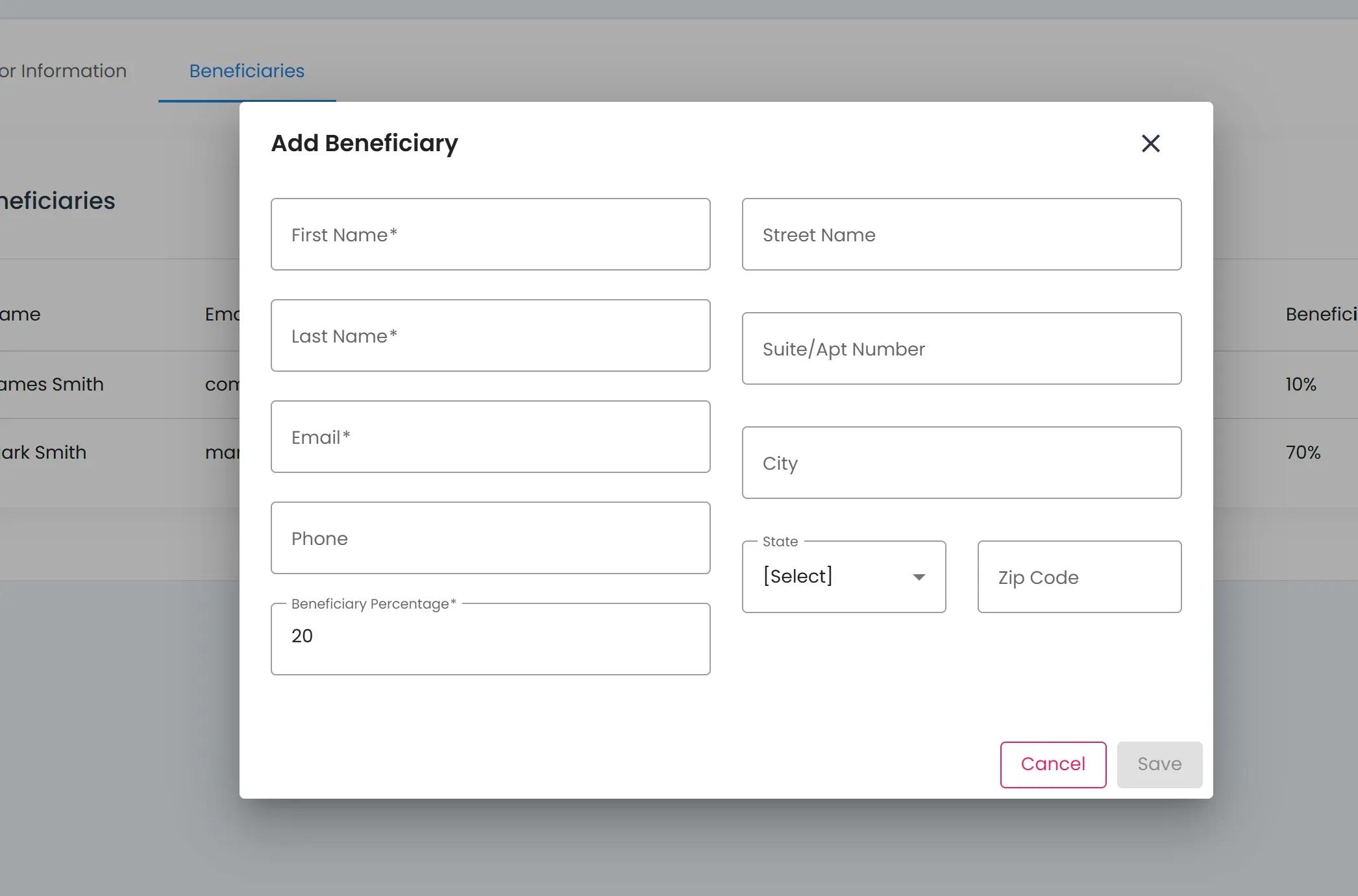 Click the plus icon [+] at the top right of the Table: Beneficiaries Table.