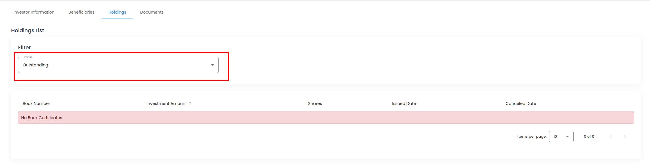 Account, Investors, Investor Information, Holdings Tab, Status Filter Dropdown#