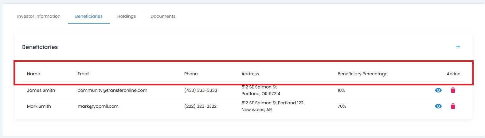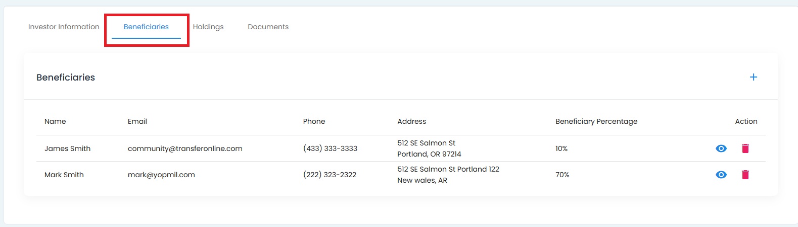 The Tab: Beneficiaries tab allows you to view and manage all beneficiaries associated with an investor.