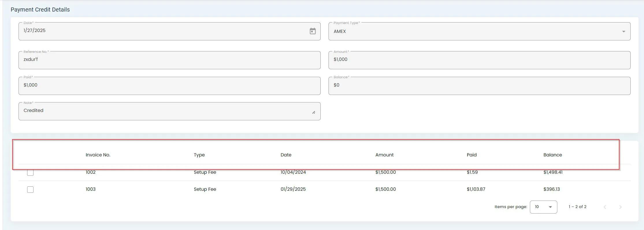 Columns of information in the Payment Details screen#