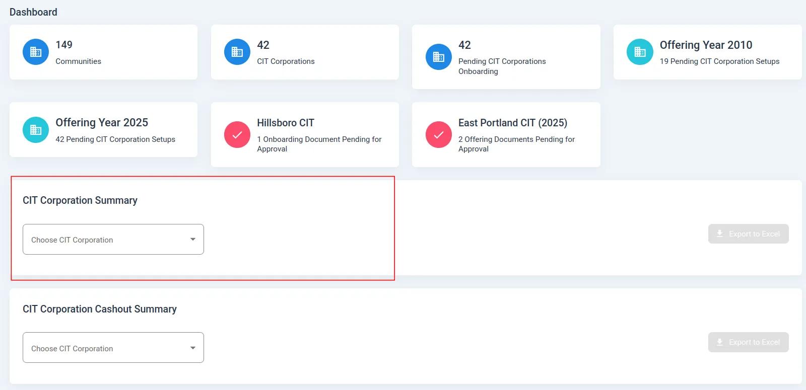 Dashboard, CIT Corporation Summary Table Location#