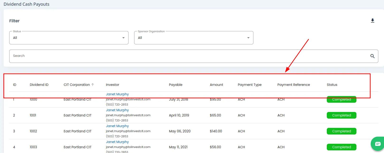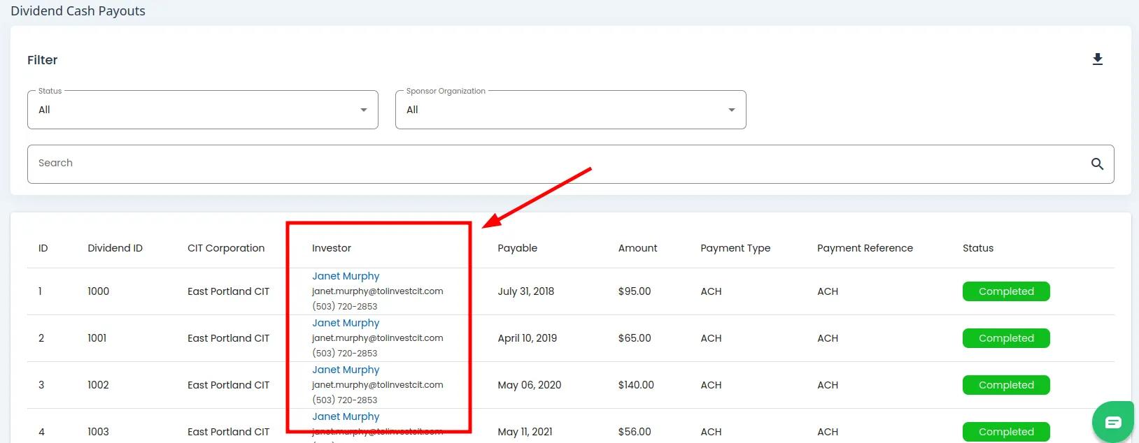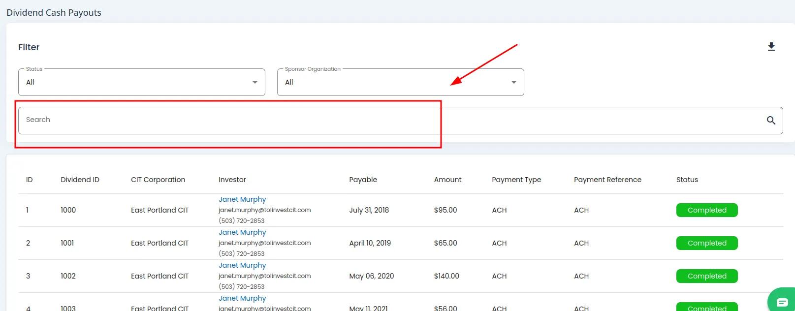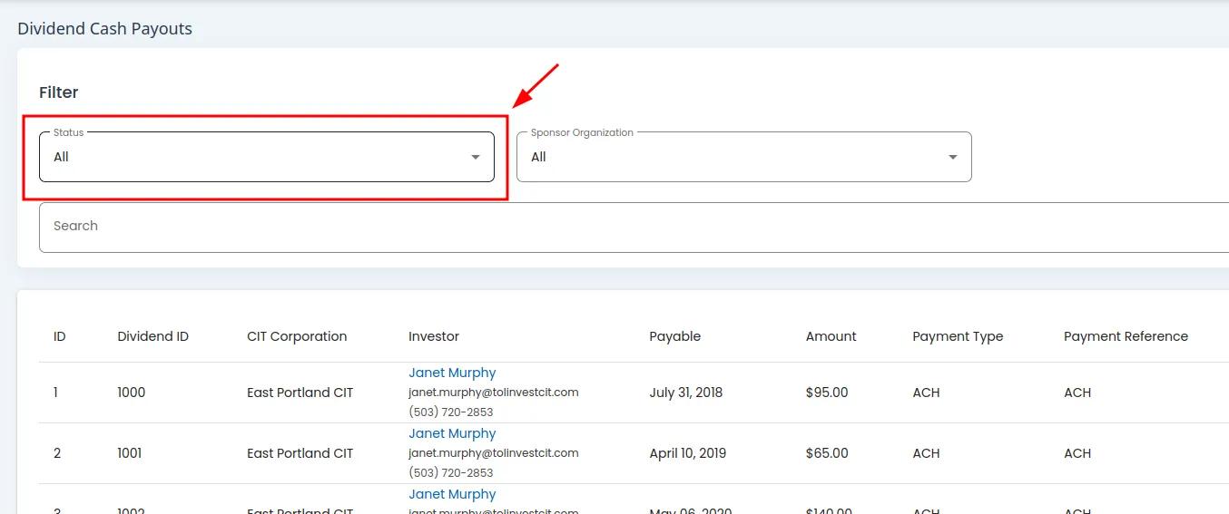 Action: Type in the Name of the Investor you want to see Option: Cash Payouts for.