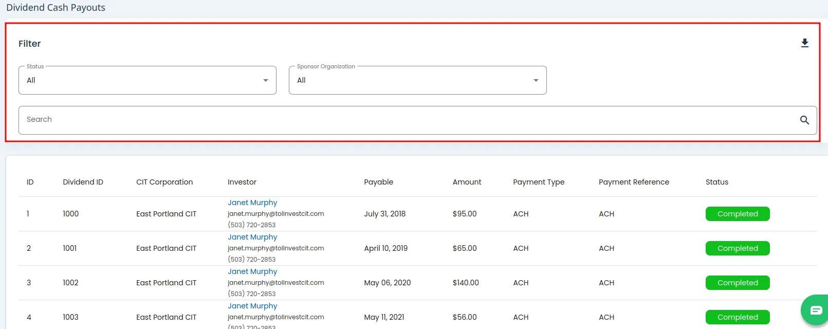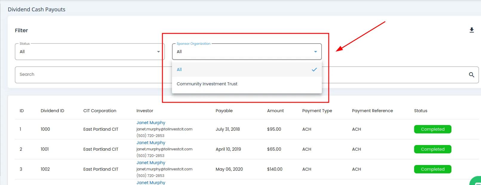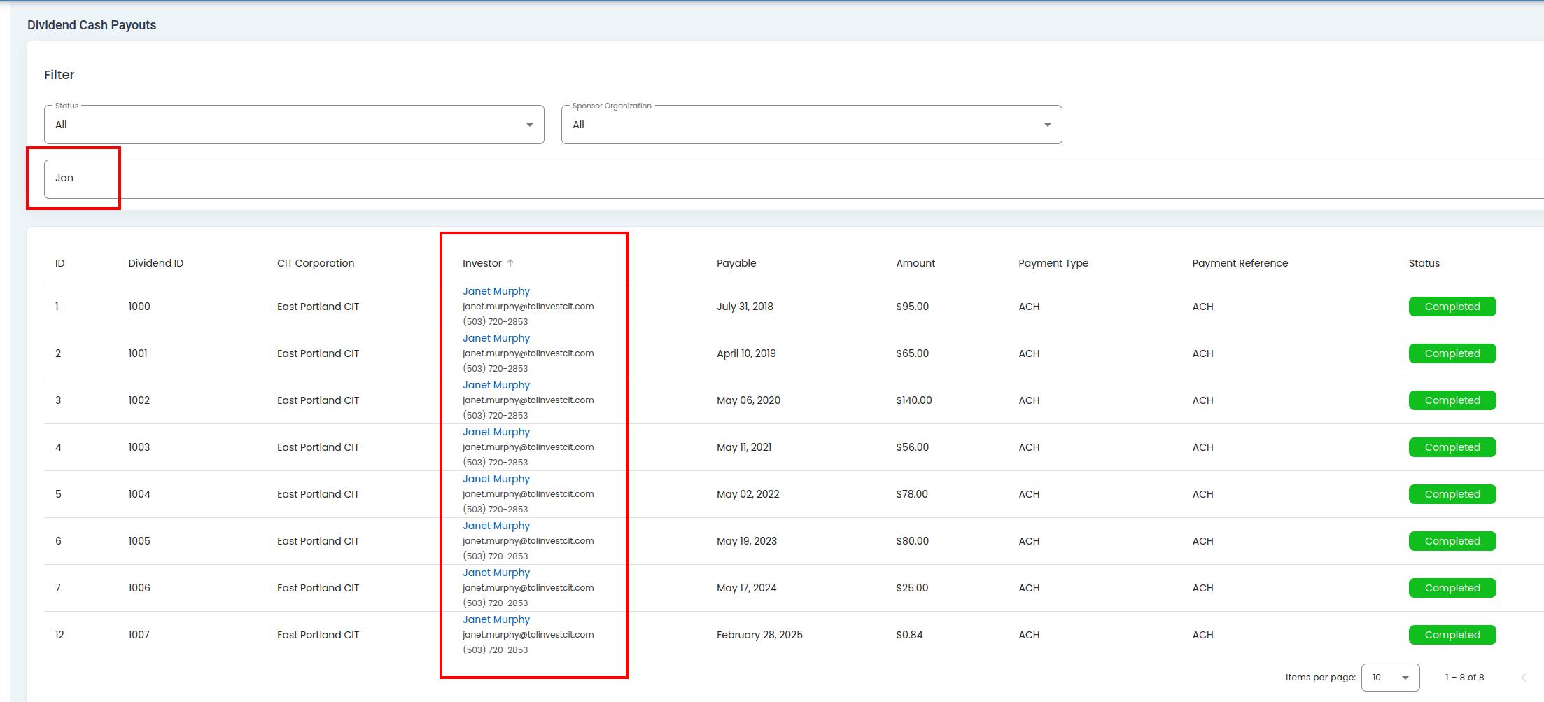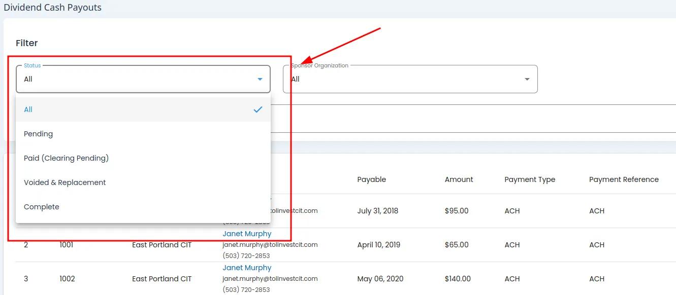 Action: Type in the Name of the Investor you want to see Option: Cash Payouts for.