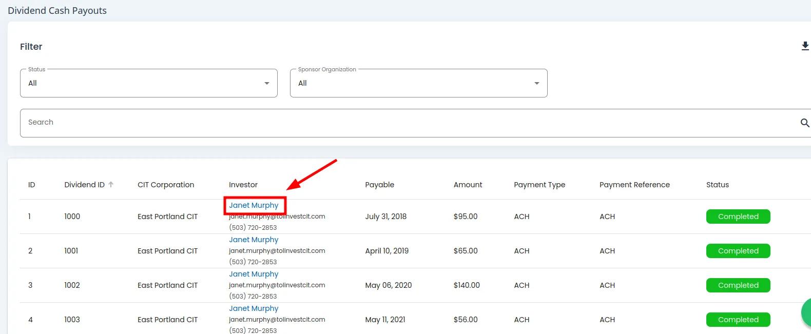 You will be redirected to the Investor Details page once you click an Item: Investor’s Name.