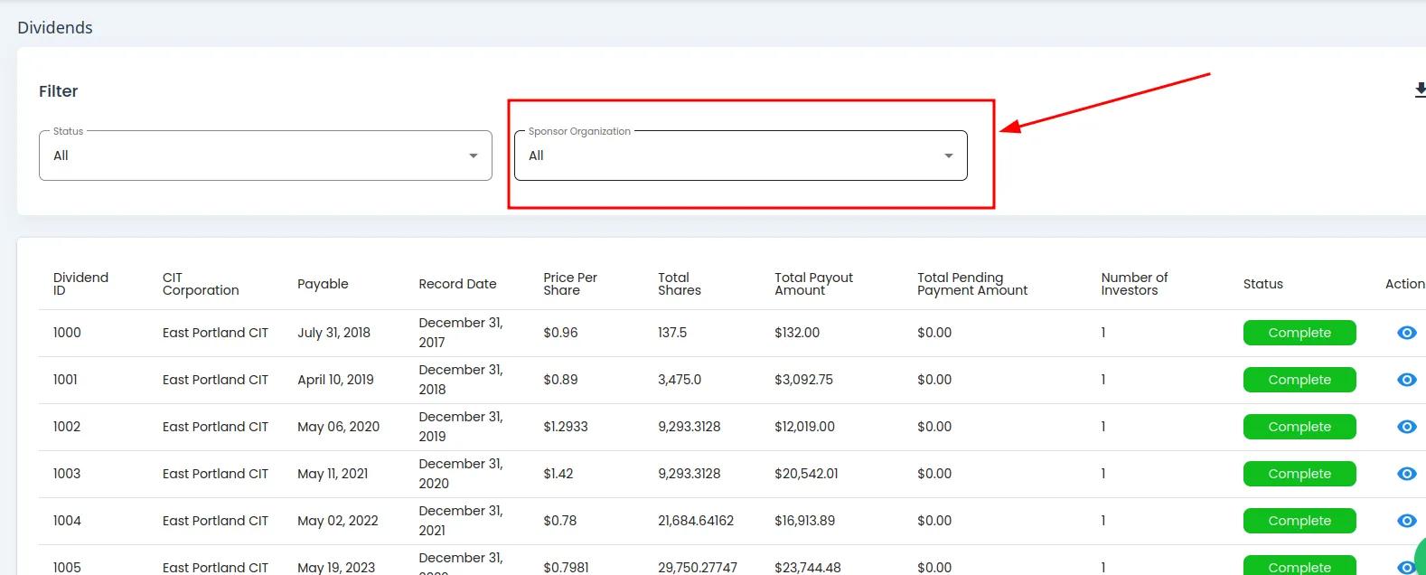 Column: Status: The current status of the dividend (e.g., Complete)