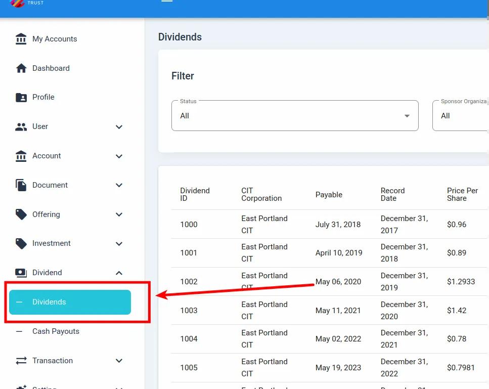 The Table: Dividends List table is what first appears on the homepage of the Section: Dividends section.