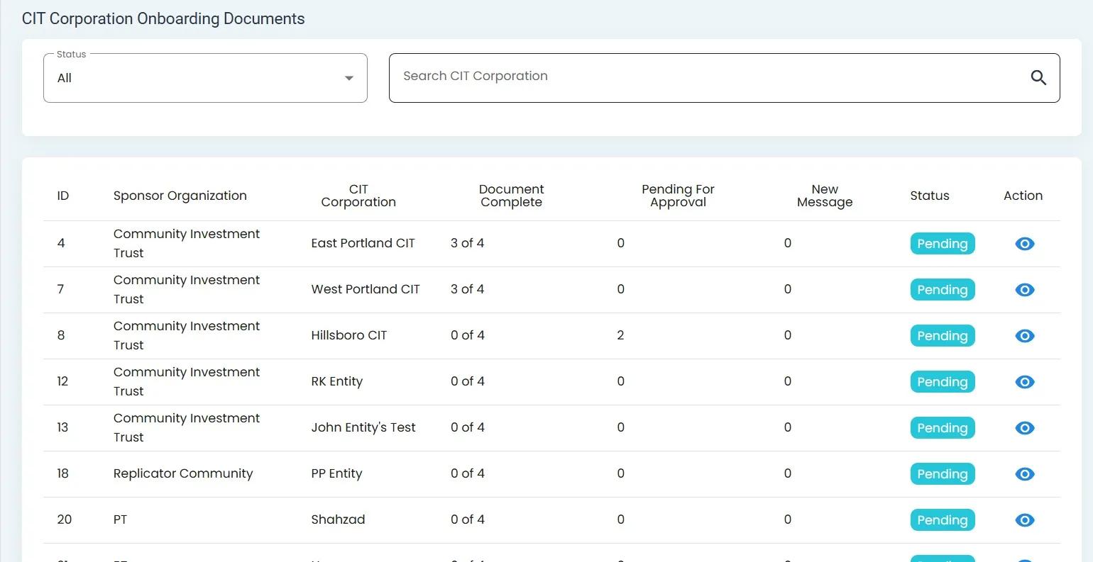 The Table: Onboarding Documents Table provides a brief, but detailed, overview of where each CIT Corporation is at in the onboarding process.