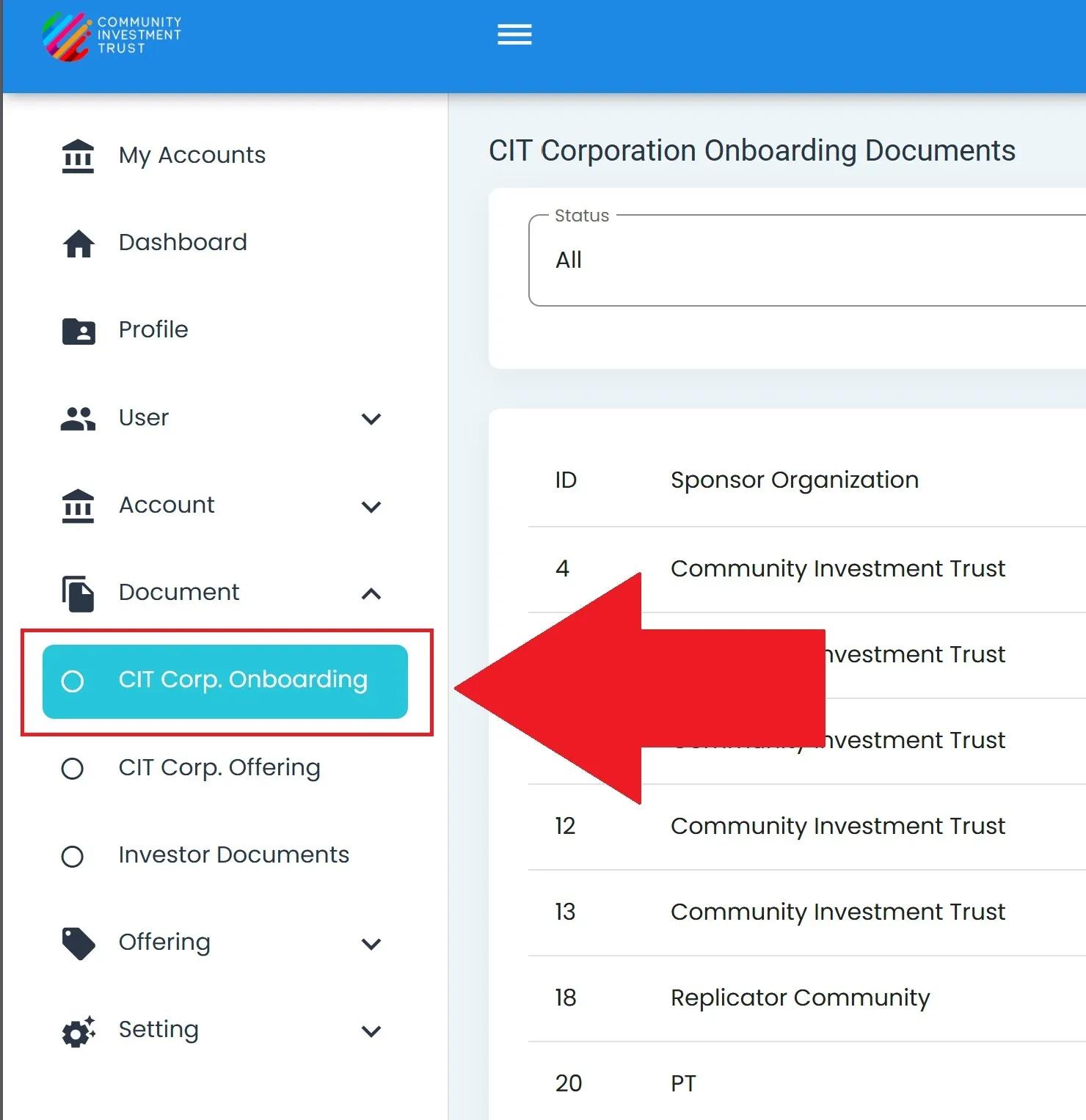 The Section: CIT Corp Onboarding section opens up to the Table: Onboarding Documents table: