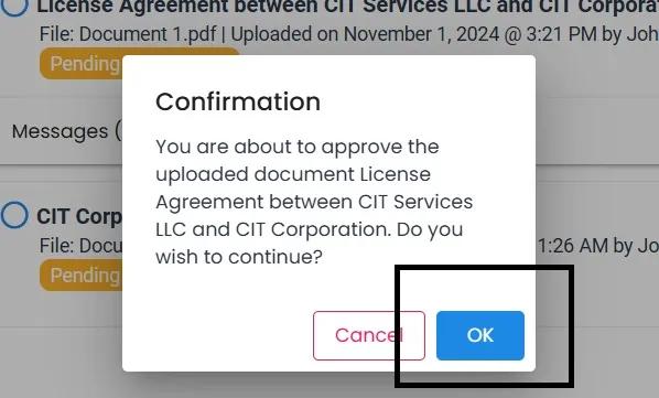 Read Confirmation pop-up, and select “OK” to approve the document.