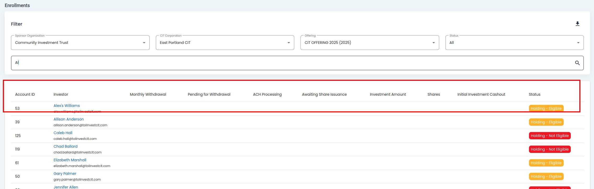 The Table: Enrollments table allowws you view any Option: Investors with the following status: