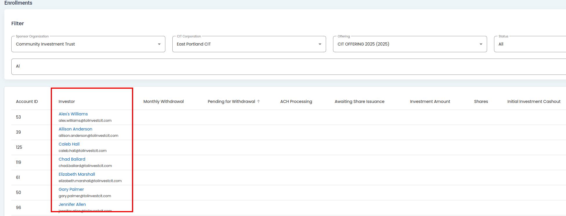 This section covers how search for Investors in the Table: Enrollments table works and what the options are.