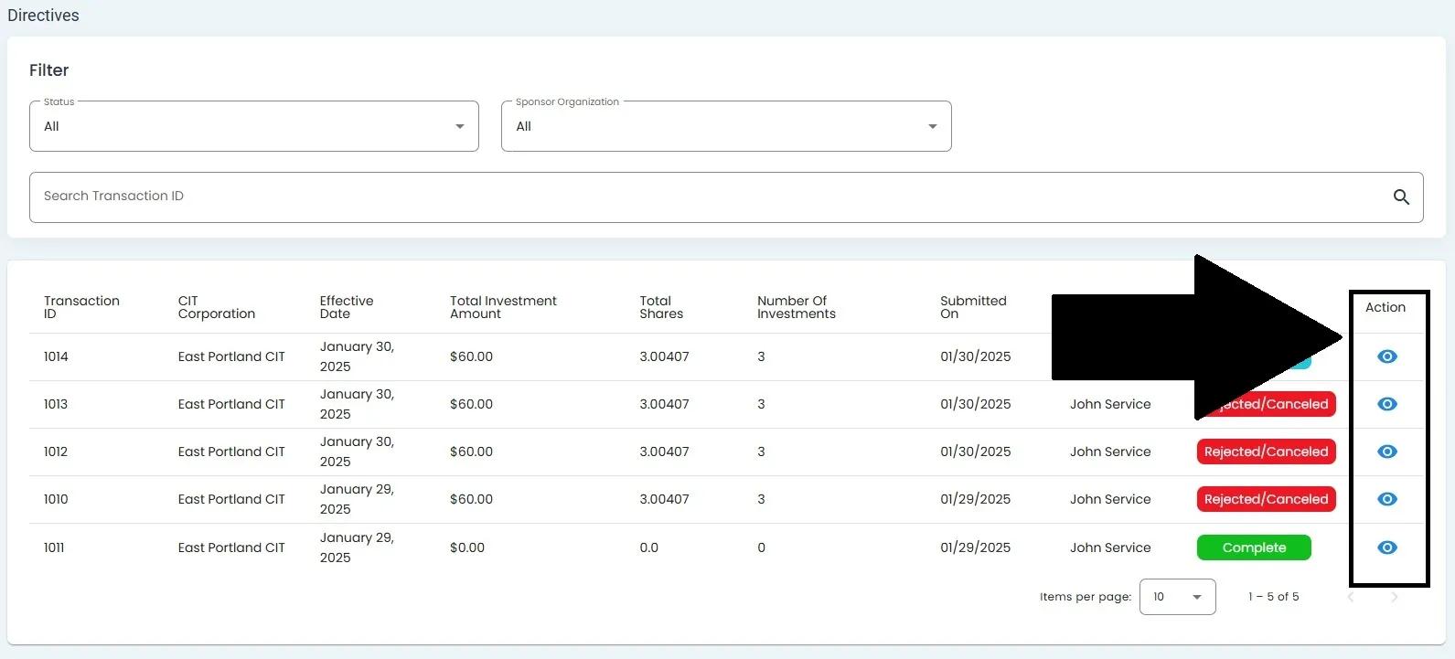 Directive Details Screen showing comprehensive information about Transaction ID 1014 including Info and Investments sections#