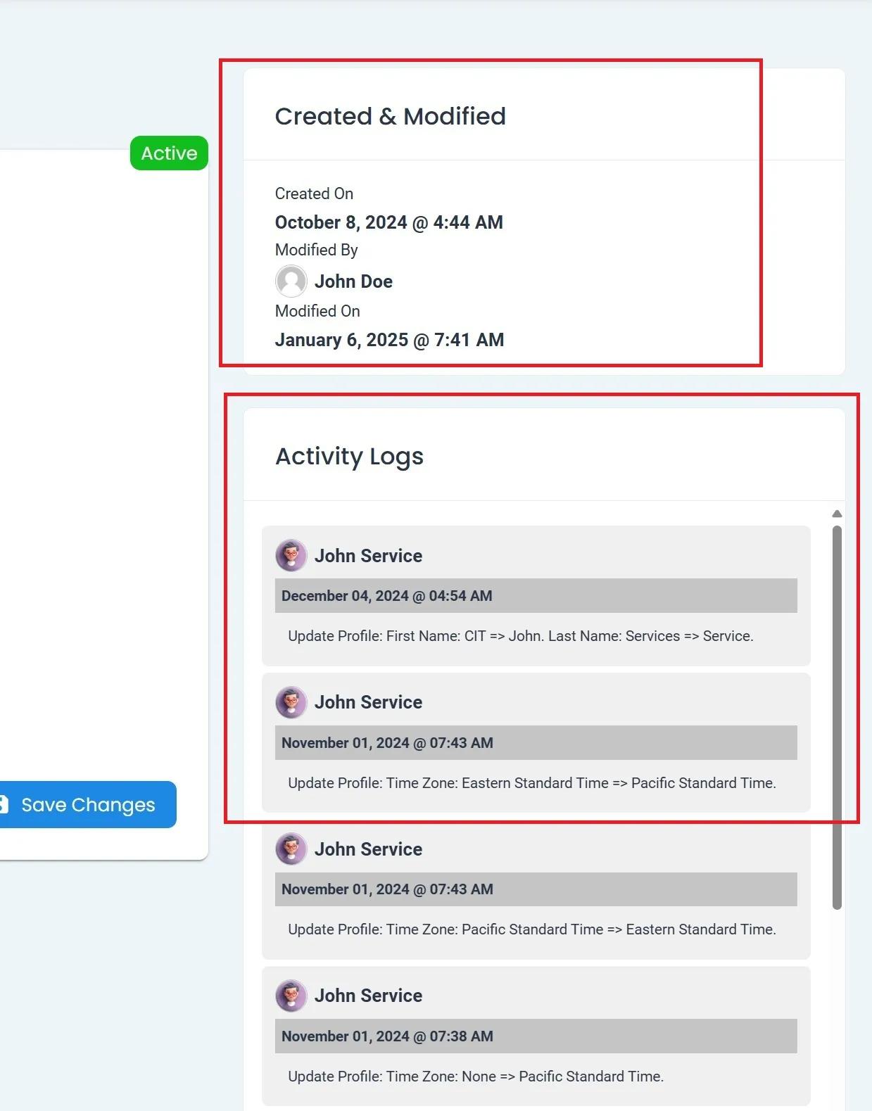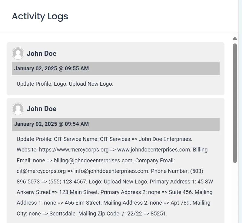 The Activity Logs section contains a list of changes made to the company’s profile.